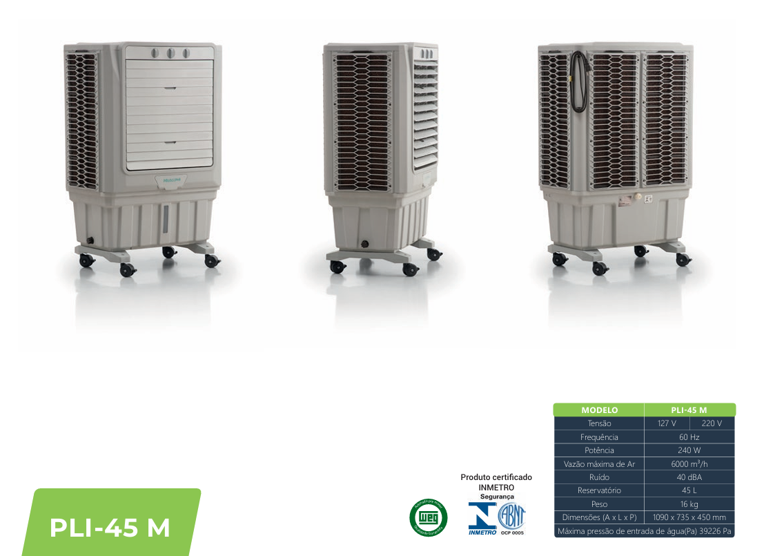 O novo modelo conta com fechamento total das aletas frontais, proteção para bomba com sensor de nível, oscilação automática das aletas internas, exclusivo pré filtro lavável de fácil remoção, é silencioso, possui motor em alumínio, parafusos em aço inoxidável e design moderno e discreto.